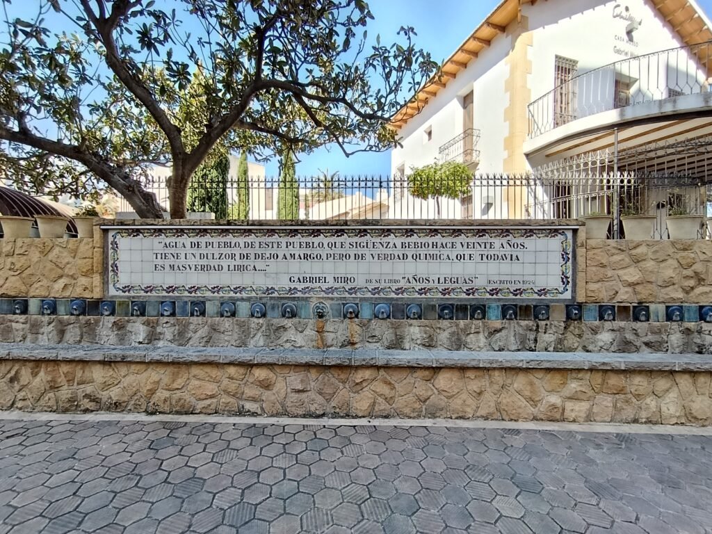 Derrière la fontaine, une citation de Gabriel Miró rappelle son attachement à cette eau qu’il décrivait avec poésie.